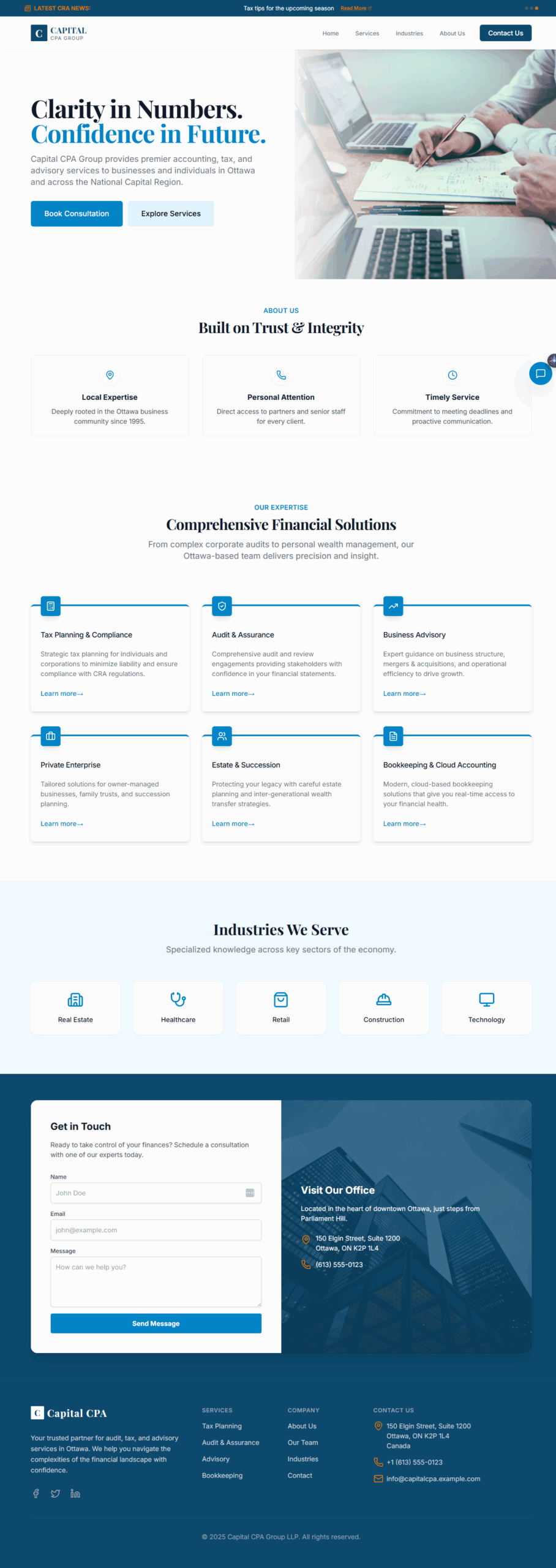 The website for Capital CPA Group immediately establishes a sense of professional trust and authority, which is paramount for an accounting firm. The visual aesthetic is clean and modern, utilizing a sophisticated color palette that likely blends reassuring blues or neutrals with ample white space. This uncluttered approach not only looks polished but also helps to calm the user, reinforcing the firm’s competence and attention to detail. The overall look conveys stability and reliability, ensuring that visitors feel confident in the firm’s ability to handle complex financial matters from the moment the page loads.
