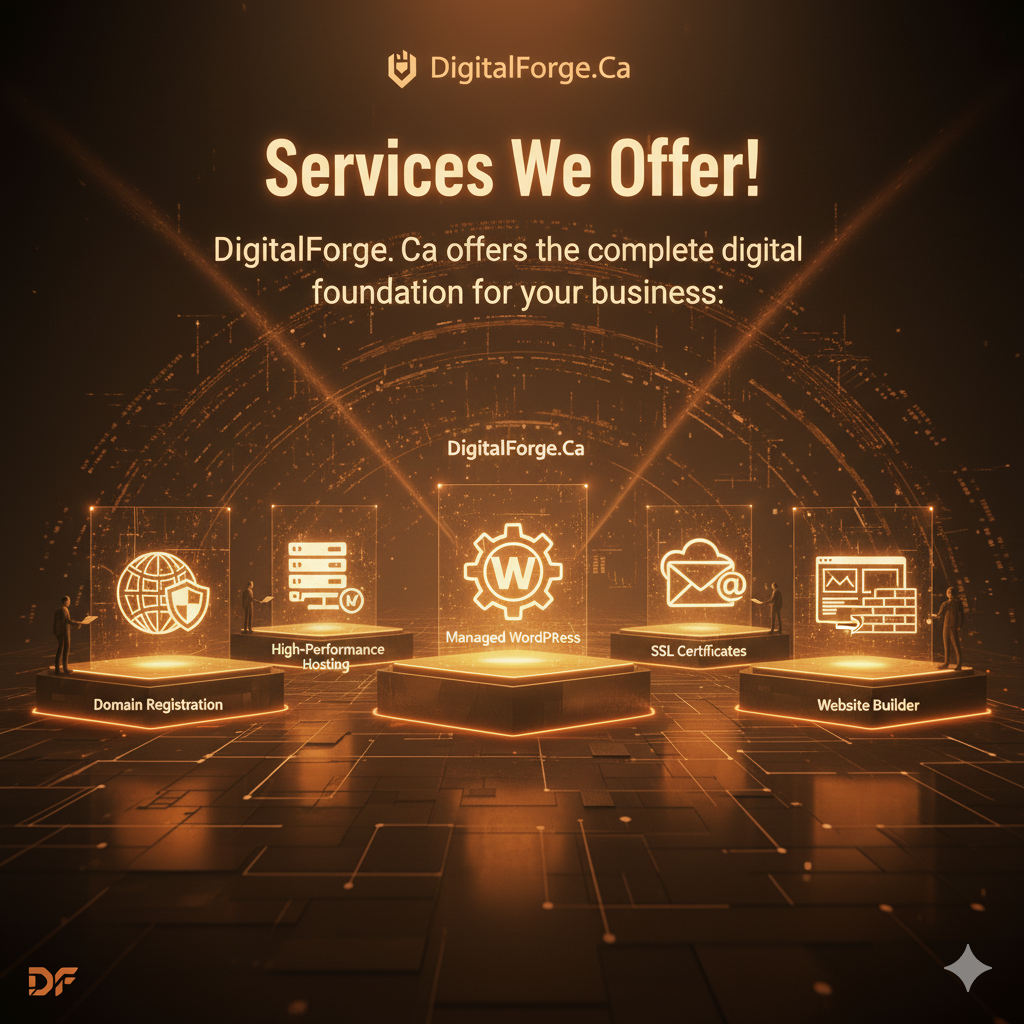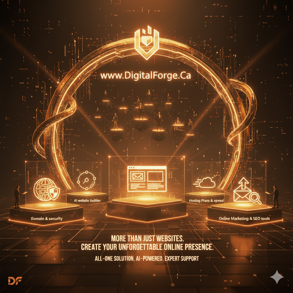 everything you need to create an effective, memorable online presence. Our groundbreaking AI-powered solution removes any roadblocks to getting a domain and creating an unforgettable website. We offer hosting plans that will keep it fast, secure and online. Our professional email helps you build a professional image, while our online marketing tools empower entrepreneurs to get online with an SEO-friendly website. DiditalForge.Ca is an all-in-one solution provider to get your idea online, backed with expert, personalized support.